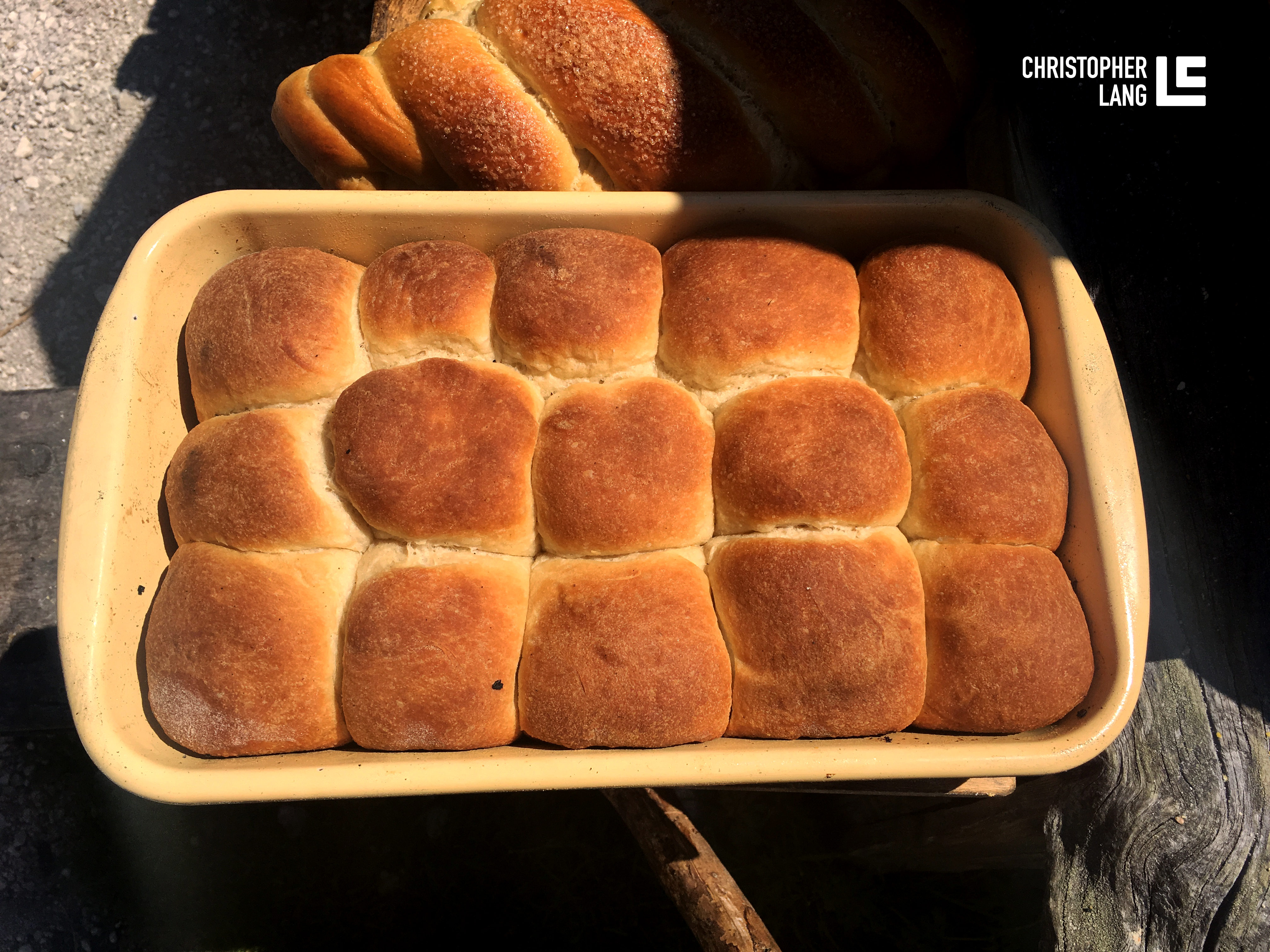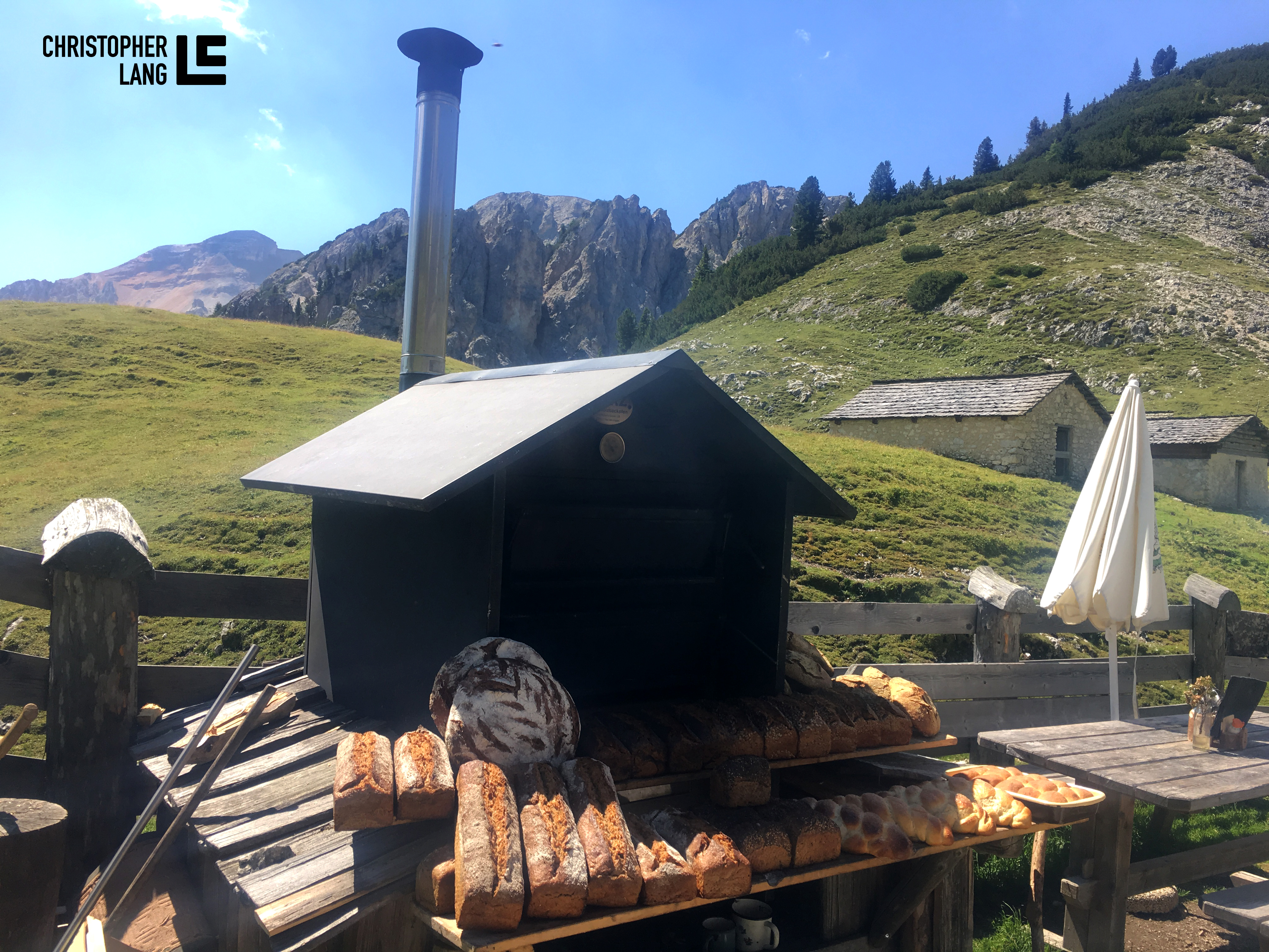 Vom händischen Ziegen melken, bis hin zum Käse machen und Sauerteigbrot backen war alles an leidenschaftlicher Lebensmittelherstellung zu sehen. Mein persönliches Highlight war natürlich das Brot backen. Am Vortag knetete Simon den Teig in einem Holztrog per Hand. Dies veranschaulichte mir wieder wie schwer es zu damaligen Zeiten war, als es noch keine Knetmaschinen gab. Nach der Autolyse wurde der Teig nochmals durchgeknetet und anschließend in geölte Behälter gegeben. Dort konnte der Teig in Ruhe rasten und sich durch mehrere Faltungen entwickeln. Die Außentemperatur in der Nacht war für diese Jahreszeit schon sehr kühl und damit waren es die idealen Bedingungen um den Teig draußen stehen lassen zu können. Durch die lange Reifezeit über Nacht wird der Teig bzw. das gebackene Brot besser verdaulich und es bekommt eine extra Portion an Aromen mitgeliefert.