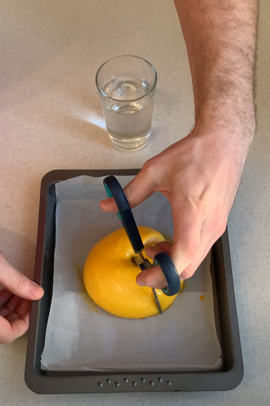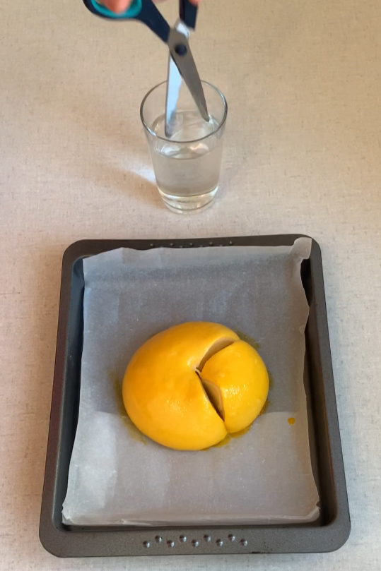 In der Zwischenzeit wird der Backofen auf 160 °C (Ober- und Unterhitze) vorgeheizt und eine Schere in einem Glas Wasser bereitgestellt.