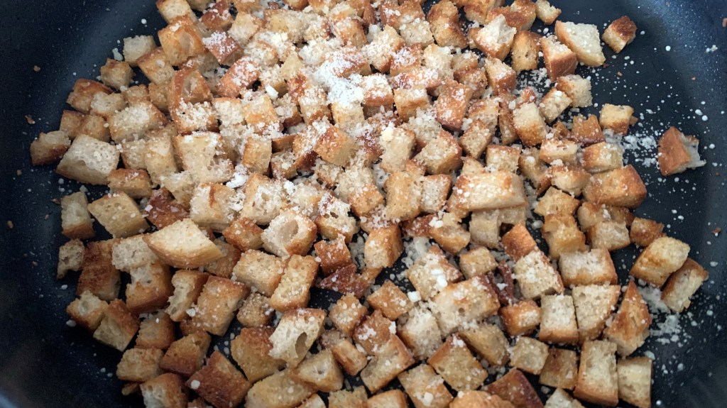 Wenn das Fett in der Pfanne heiß geworden ist wird der Knoblauch entfernt und die Brotwürfel hinzugefügt. Danach die Hitze am Herd reduzieren, damit die Brotwürfel langsam rösten und das Wasser in den Würfeln verdampfen kann.