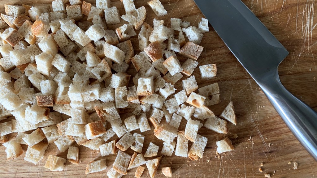 Zuerst das trockene Brot mit einem Messer in ca. 1 cm große Würfel schneiden. Hervorragend eignet sich dazu auch der Würfelschneider von Kenwood*, mit dem du problemlos auch größere Mengen zu Hause in Würfel schneiden kannst.