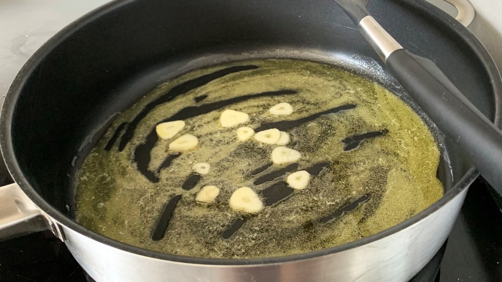 Das Olivenöl und die Butter in einer großen Pfanne schmelzen und die Knoblauchzehe dazugeben. Damit sich der Knoblauchgeschmack noch intensiver entfaltet, kann dieser davor noch in Scheiben geschnitten werden.