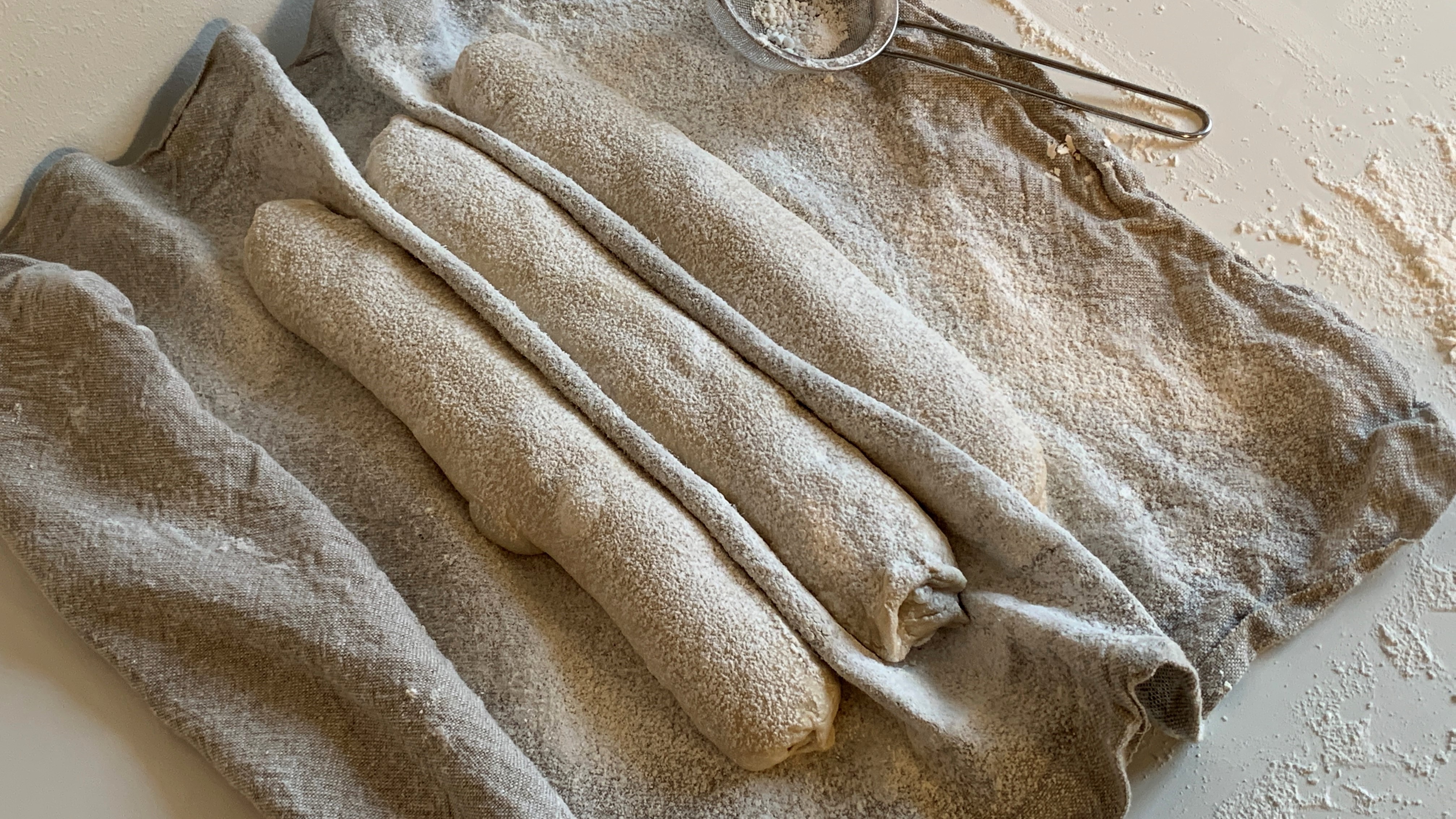 Die vorgeformten Baguette in einem mit Roggenmehl bemehlten Bäckerleinentuch einschlagen, abdecken und für 45 Minuten reifen lassen.