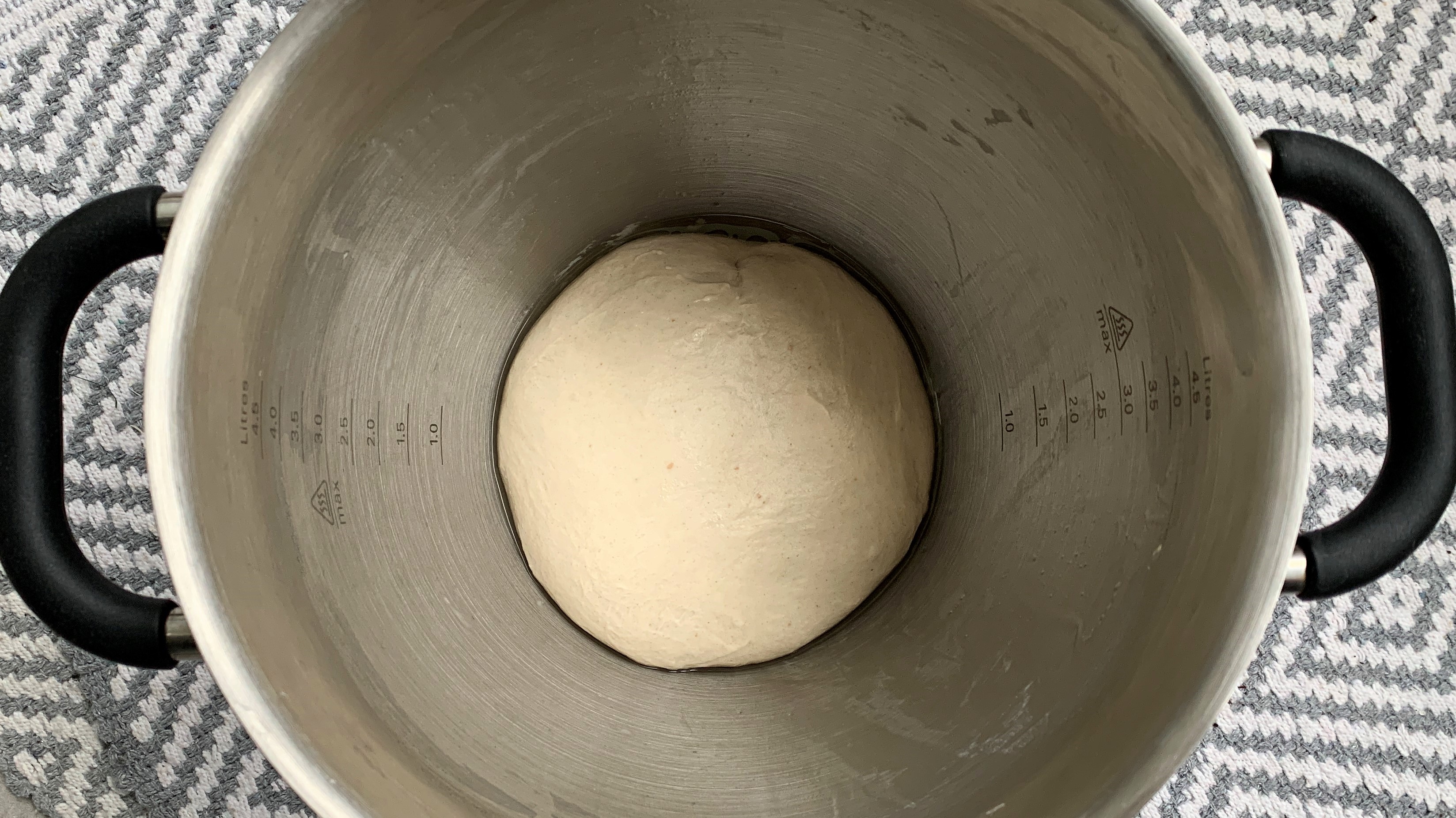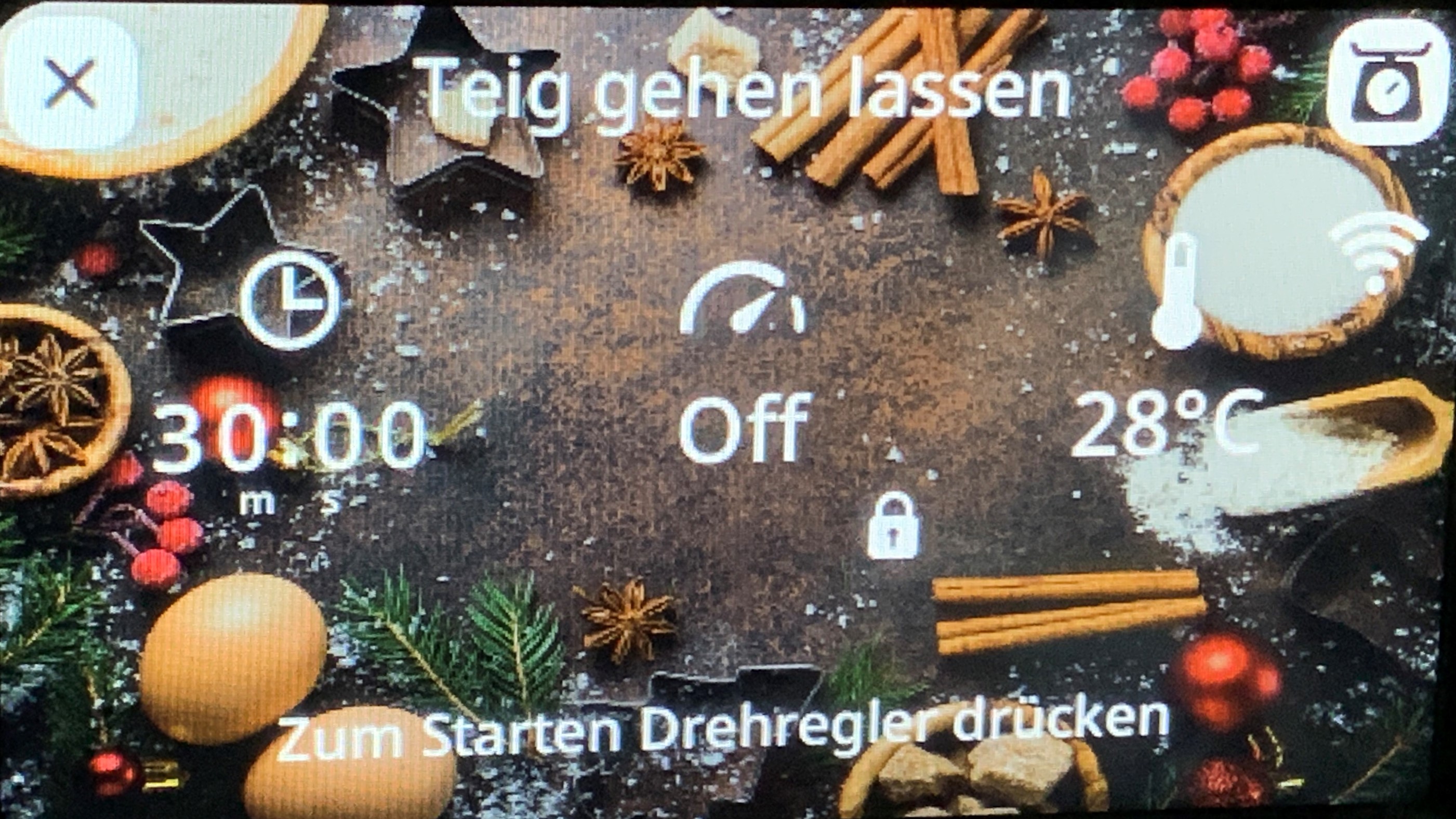 Tipp: In diesem Rezept ist sehr wenig Hefe enthalten und wenn deine Raumtemperatur nur bei ca. 22 °C liegt, dann kann sich die Reifezeit für ein optimales Backergebnis um einiges verlängern. Für eine konstante Teigtemperatur nehme ich persönlich die Kenwood Cooking Chef zur Hilfe. Die Rührschüssel mit dem Teig einspannen, den Hitzeschutz und Deckel anbringen und die Heizfunktion auf 28 °C einstellen.