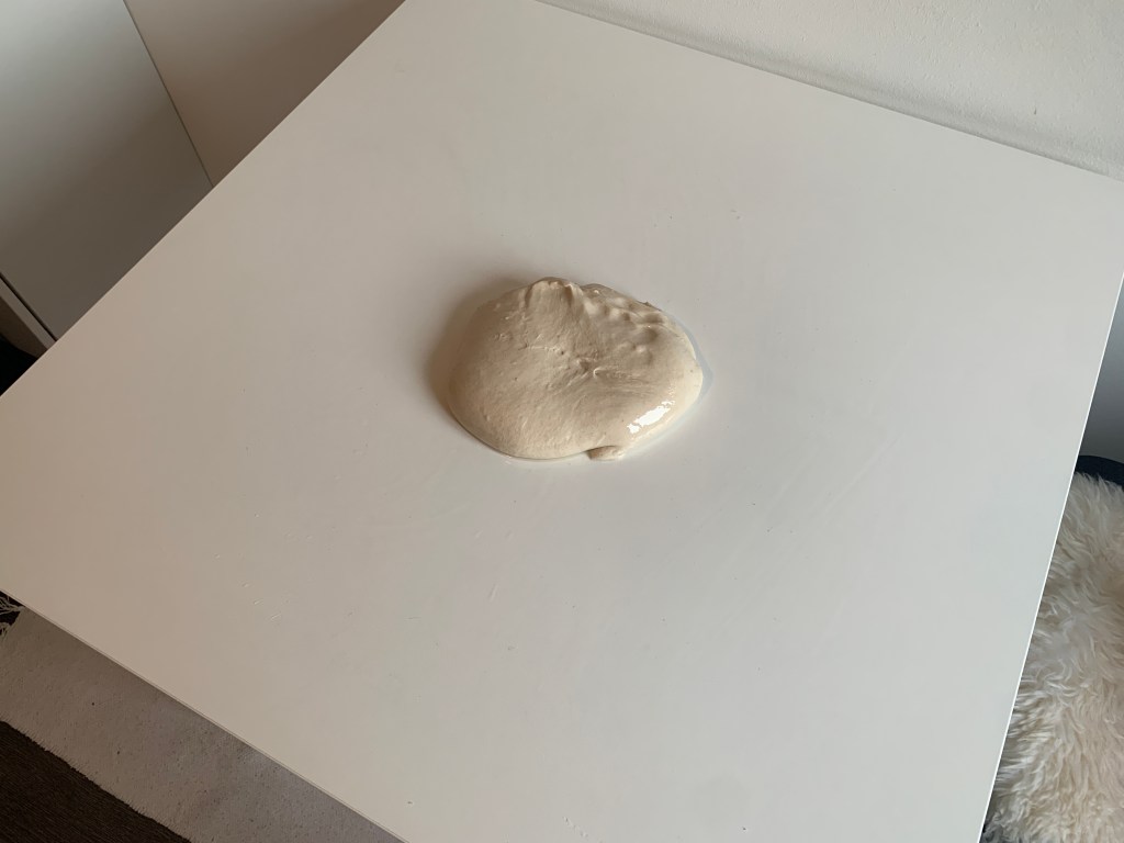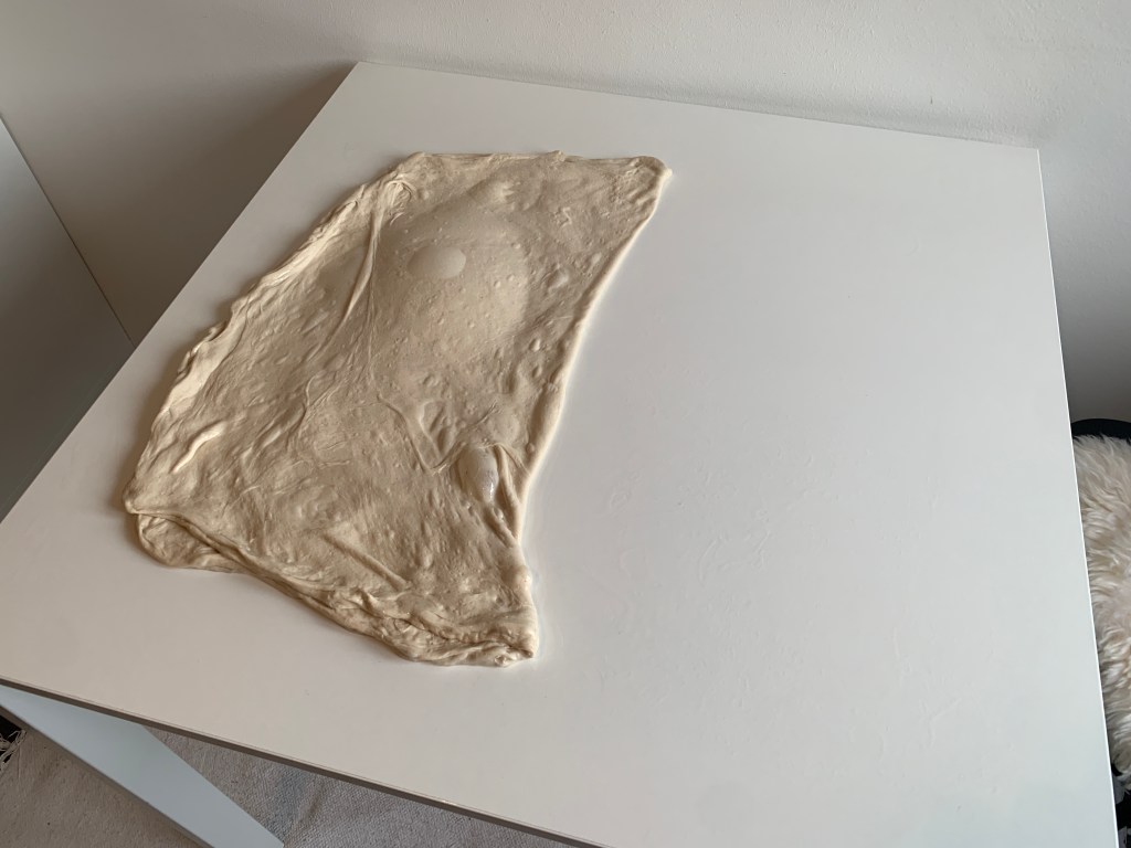 Nach der Reifezeit wird der Teig zum ersten Mal laminiert, damit die Glutenstruktur aktiviert wird. Die Arbeitsfläche mit Wasser oder Öl einstreichen, damit der Teig nicht am Tisch kleben bleibt. Den Teig vorsichtig ausziehen und danach zusammenfalten. Anschließend den gefalteten Teig in die Schüssel zurückgeben, mit einem Tuch abdecken und erneut für 30 Minuten fermentieren lassen.