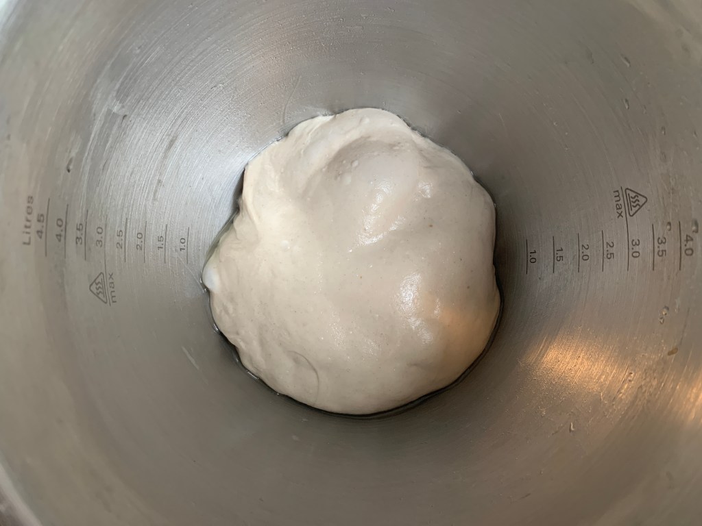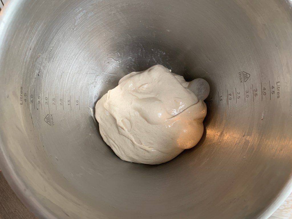 Mit der Kenwood Küchenmaschine und dem Knethaken für 6 Minuten langsam (Kenwood CC Stufe „min“) mischen und 6 Minuten schnell (Kenwood CC Stufe 2) zu einem glatten Teig kneten. Der Teig sollte nach dem Kneten sehr dehnfähig sein und sich von dem Schüsselrand lösen.